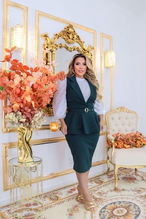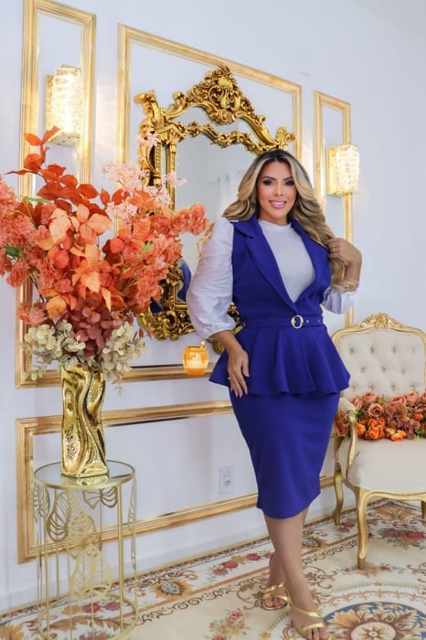 Blazer e saia: malha crepe Dior (com elastano e sem transparência). Blusa de dentro: malha Suede (com elastano) Acompanha cinto igual a foto.