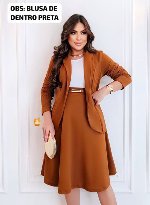 Conjunto de blazer, três peças blusa+blazer+saia, acompanha cinto igual a foto Blazer, blusa e saia: malha crepe dior (com elastano)
